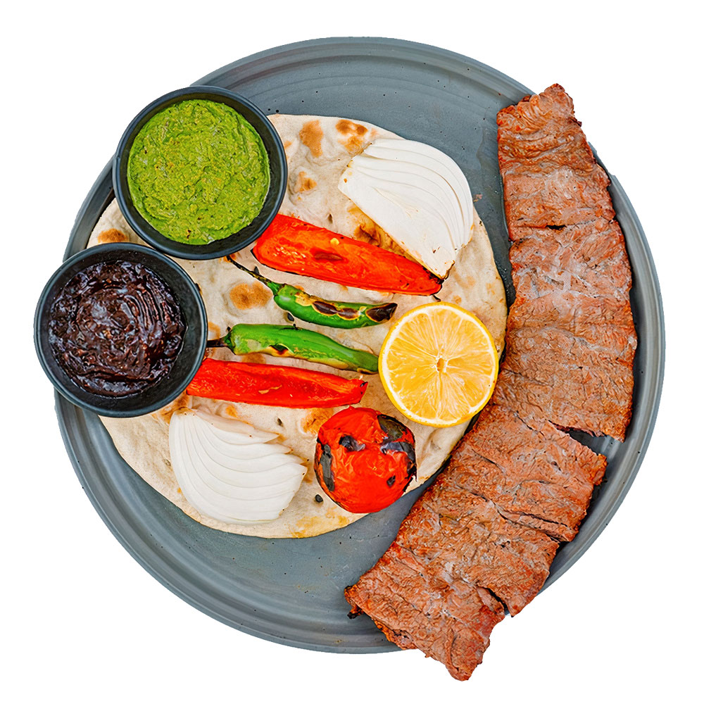 8 سیخ 250 گرمی گوشت خالص مخلوط گوسفند و گوساله همراه با گوجه، لیمو، سبزیجات کبابی و سس ریحان